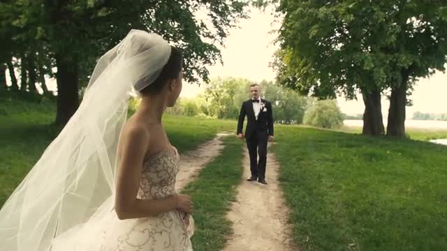 > 1959: beautiful bride walking along with her bridesmaid to wedding place IOWA