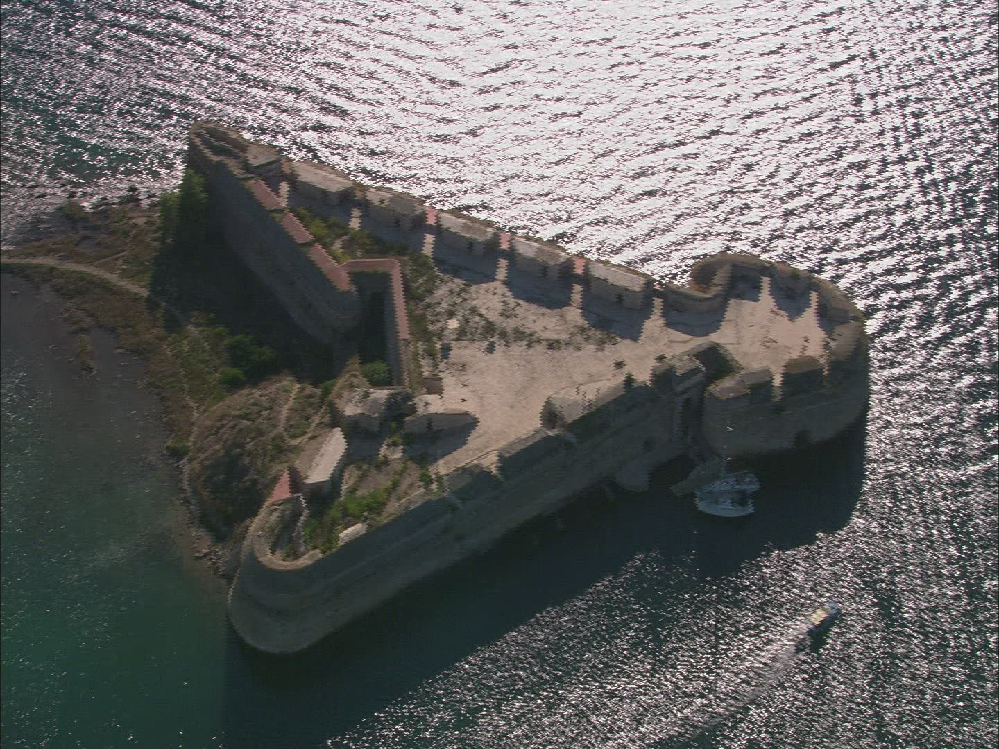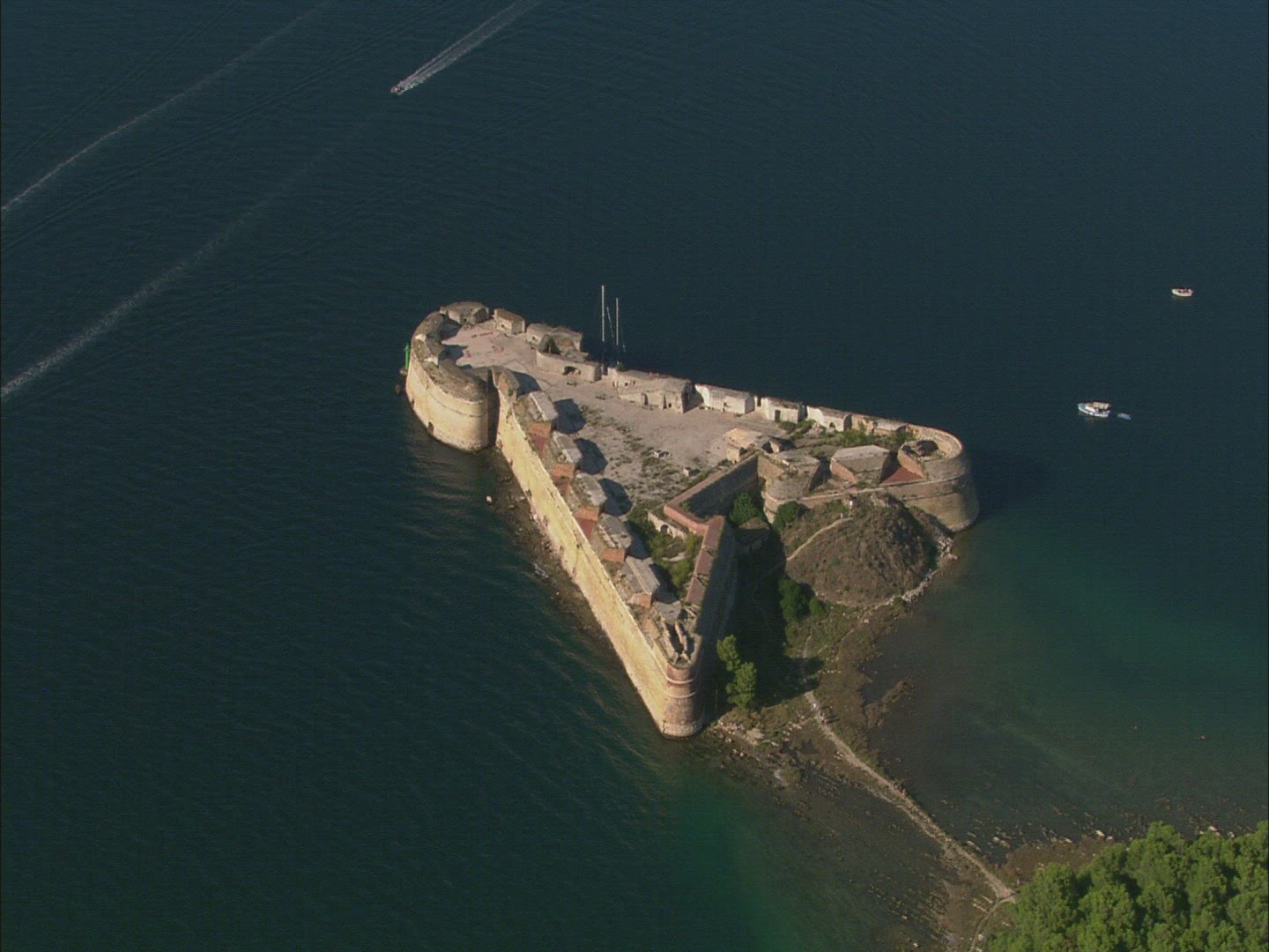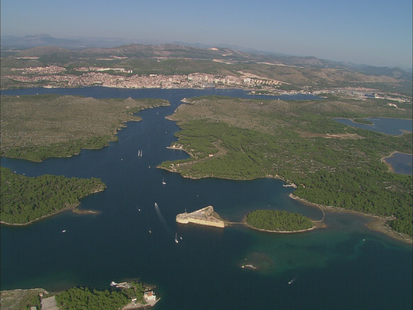 Aerial drone scene of two isolated islands on the Dalmatian coast catamaran between them.