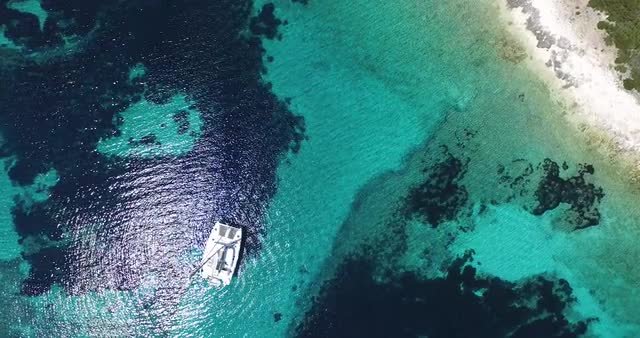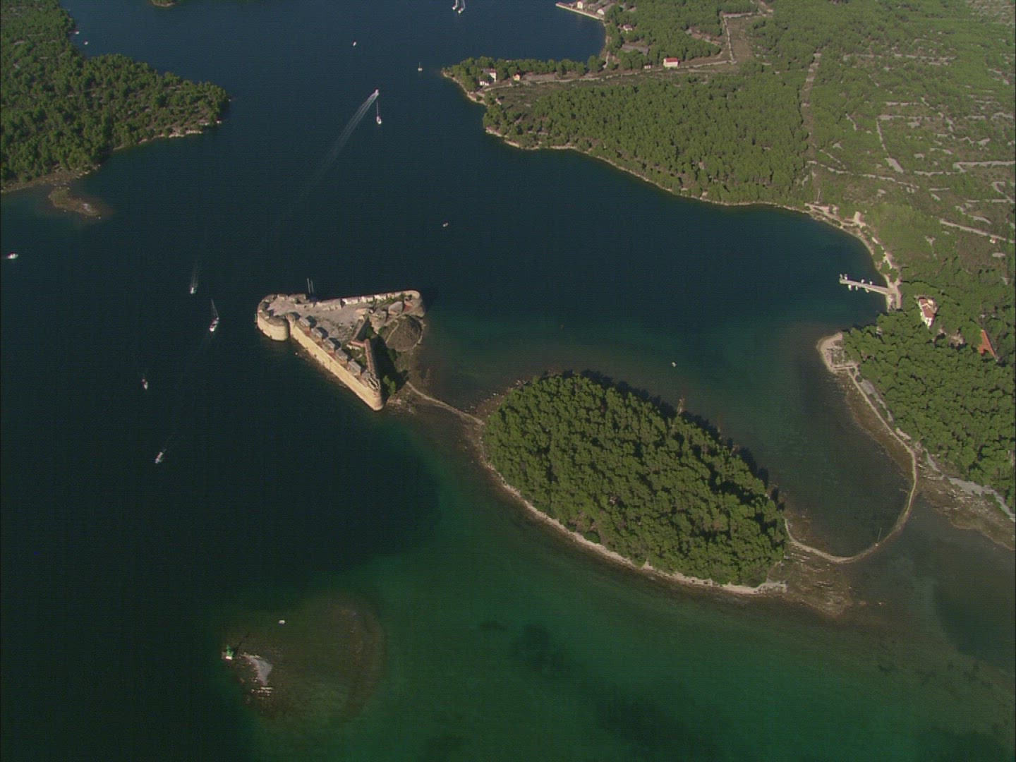 Aerial drone scene of two isolated islands on the Dalmatian coast catamaran between them. Transparent water. Paradisiac place. Adriatic sea. Static camera.