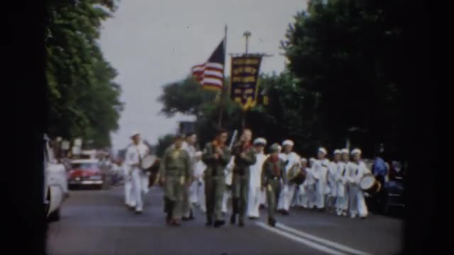 > 1959: men marching down street during parade IOWA