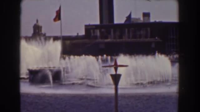 > 1971: tourists gather around european water fountain in commercial district. MOSCOW RUSSIA