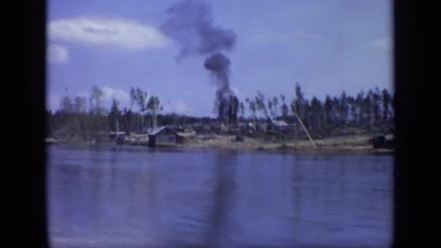 > 1971: videographer on boat films smoke plume coming from shore MOSCOW RUSSIA