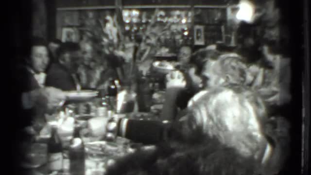 > 1975: party of children gathered around dining table, enjoying group of people with laugh. RUSSIA