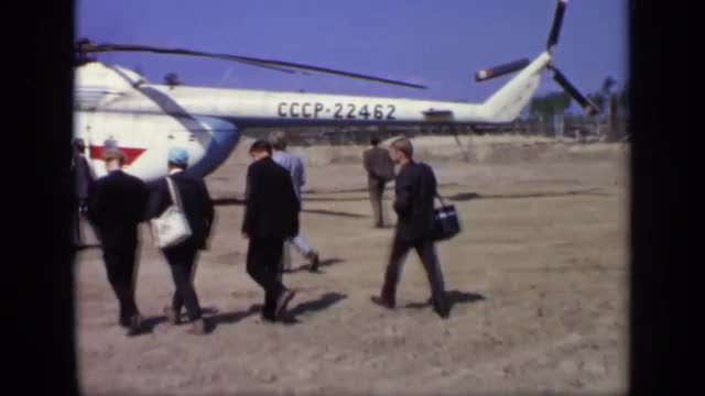 > 1971: group of peoples are going near helicopter during day time MOSCOW RUSSIA