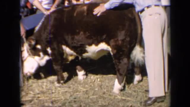 1964: people are watching cow's and man hit cow by using stick KANSAS