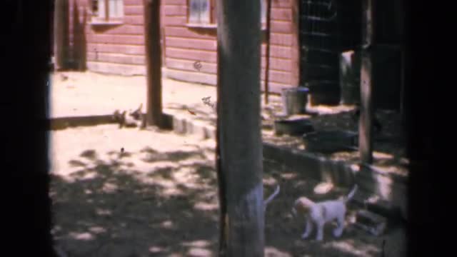 > 1964: several cute dogs and puppies outside, around rustic old barn or house KANSAS