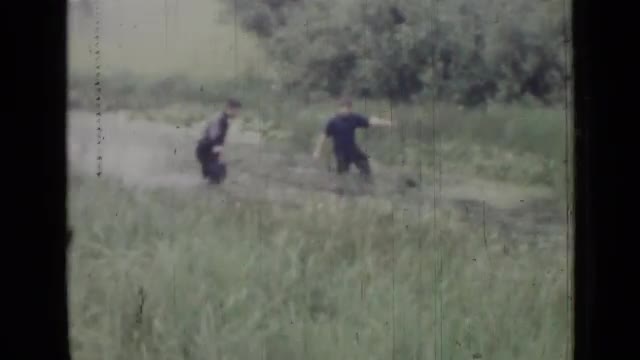 > 1967: two men wading through marsh and retrieving something. RUSSIA