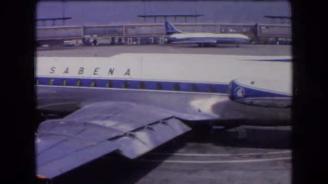 1963: slow pan along length of sabena airplane's exterior at airport FRANCE