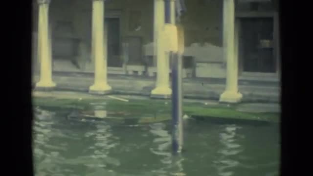 > 1962: man poles boat through canal, over deep waters next to ancient buildings VENICE ITALY