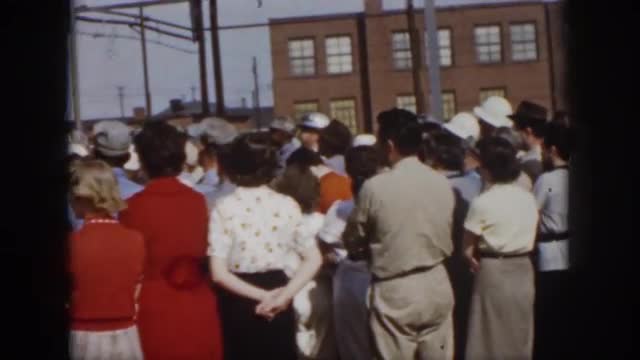 > 1961: gathering of many people of different ages walking through open area to one common venue. MISS