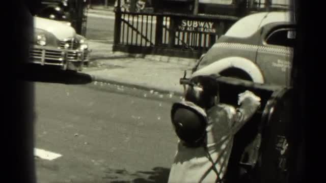 1949: the child was running on platform and putting dust in dustbin box NEW YORK
