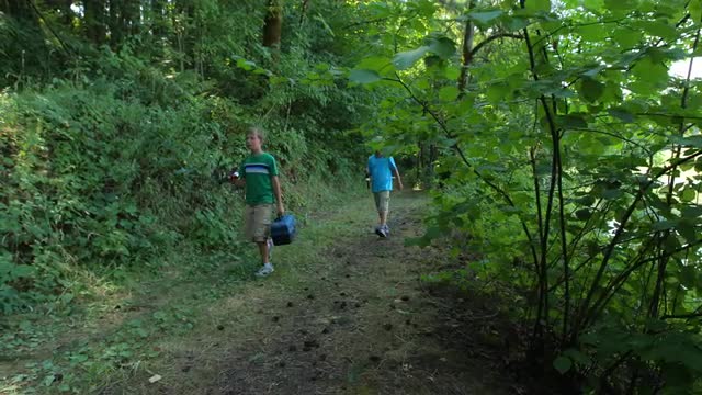 714461 - A fisherman walking through the forest