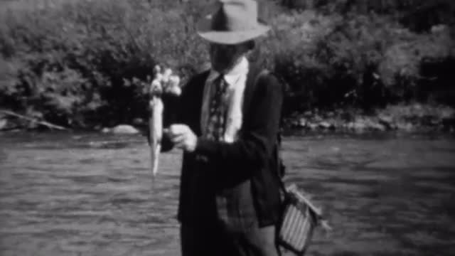 487557 - 1939: Fisherman wading in fast stream showing trout fish catch.