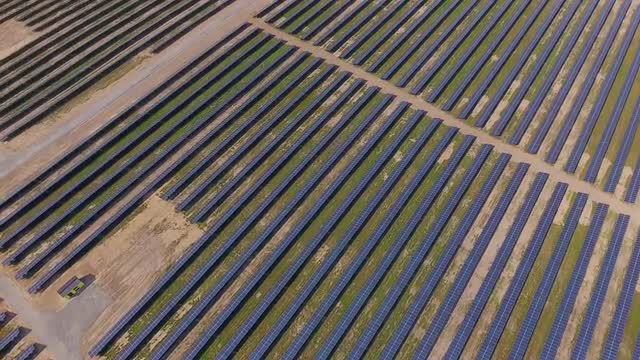 Aerial View. Flying over the solar power plant with sun. Solar panels and sun. Aerial drone shot. 4K 30fps ProRes (HQ)