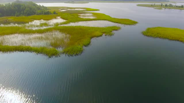 > Aerial View. Flying over the green trees above the river at dawn with the sun rays. Aerial drone sho