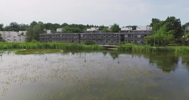 > Aerial View. Flying over the green trees above the river at dawn with the sun rays. Aerial drone sho