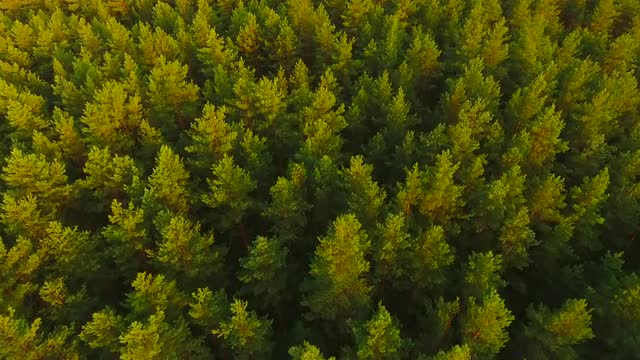 Aerial View. Flying over the forest trees. Aerial drone shot. 4K