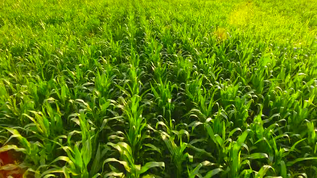 > Aerial View. Flying over the corn field. Aerial drone shot. 4K