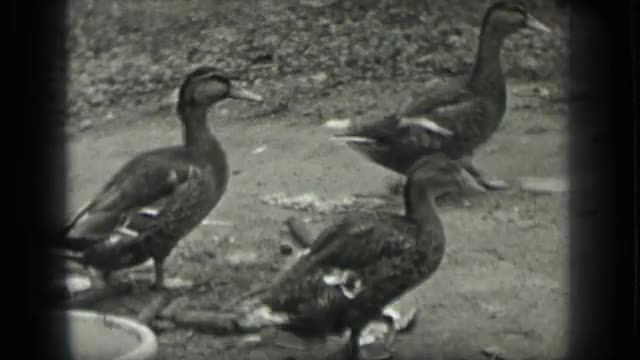 > 1939: a girl looking the goose and the goose searching food for them at the garden. LONG LAKE CANADA