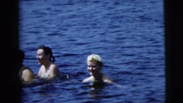 > 1939: blond male and woman wearing a swimming cap, both swimming LONG LAKE CANADA