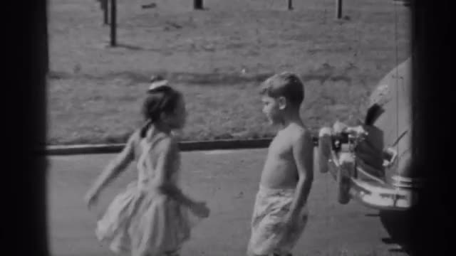 > 1947: a girl child putting something on grass and enjoying running with her brother on roadside. NEW