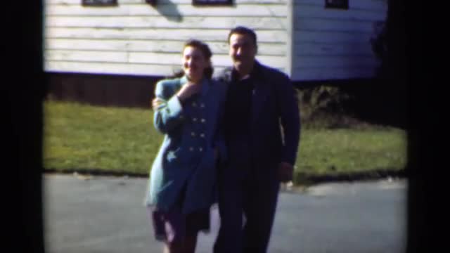 > 1947: romantic couple walking in a small neighborhood. NEW YORK