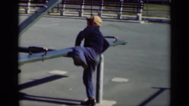 1947: a boy at a park playing with a seesaw ride. NEW YORK