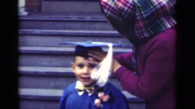 > 1948: a mother adjusts a graduation cap on a smiling boy at the foot of an outside staircase INDIANA