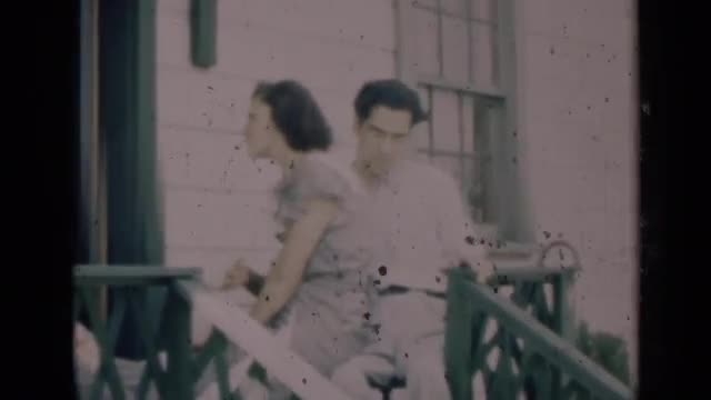 > 1948: a woman site on a mans lap on a front porch while talking to an older couple. INDIANA