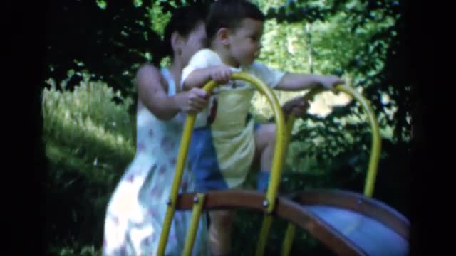 > 1951: video of kids having fun and slipping on slide in the nature NEW YORK