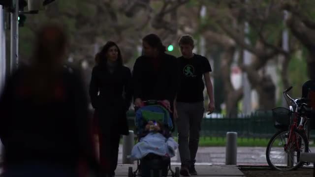1951: toddler in a coat pushing a cart down a road outside, near a large city NEW YORK