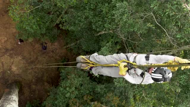 1951: boy playing on tree, hanging and swinging from the branches. NEW YORK