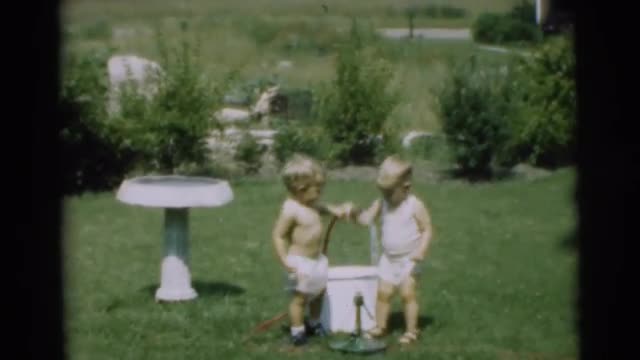 1951: two funny and naughty boys standing on the terrace with a hose to collect water NEW YORK