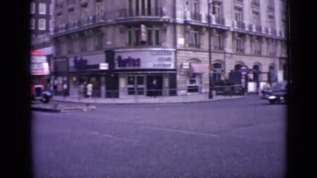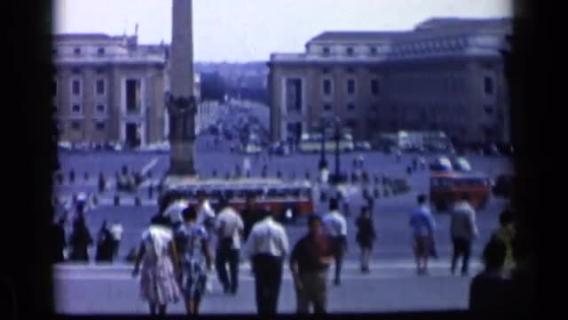 > 1960: people are walking around the main building that may be junction of bus or train at the mornin