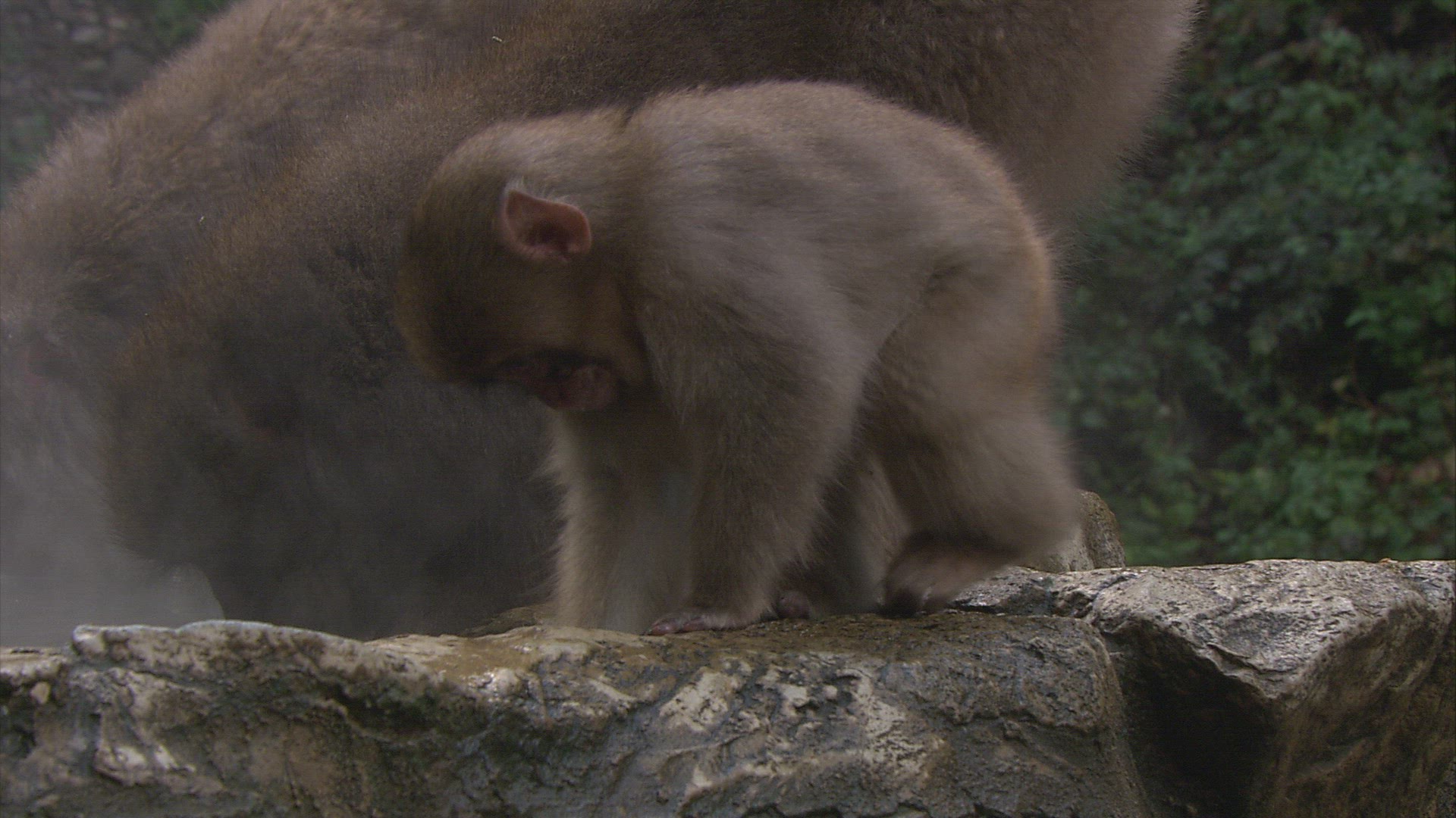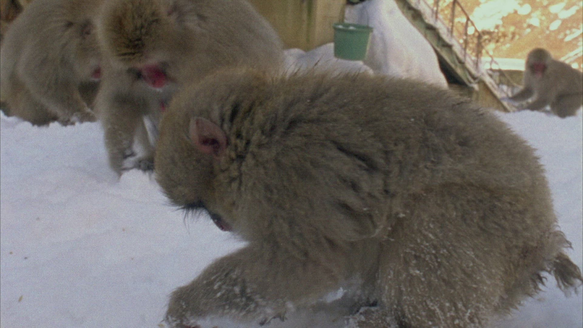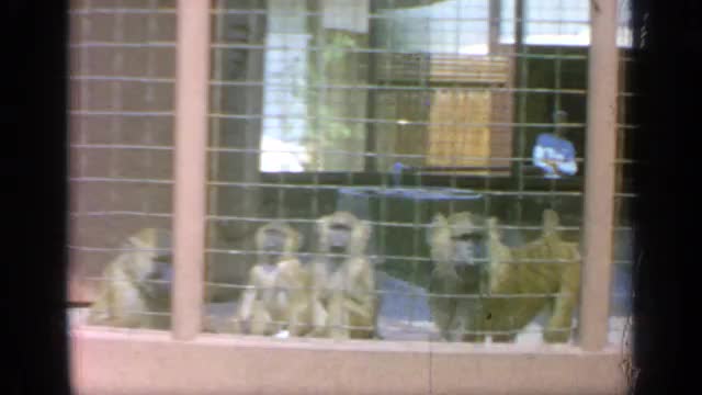 1964: monkeys are inside the gate at the zoo and people are ready to watch the monkeys. WORLDS FAIR
