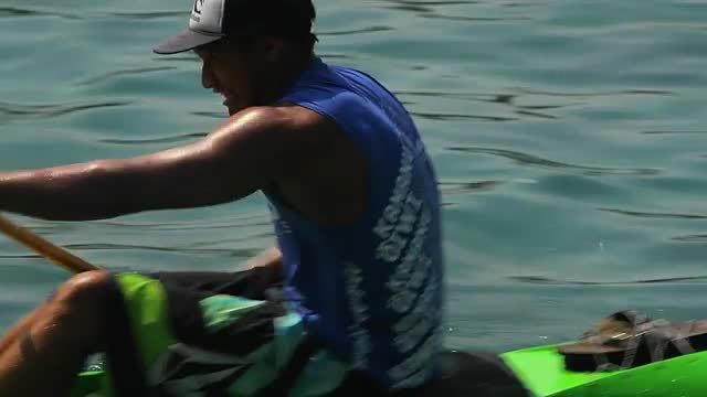 164366 - A man rows a kayak fast across the water.