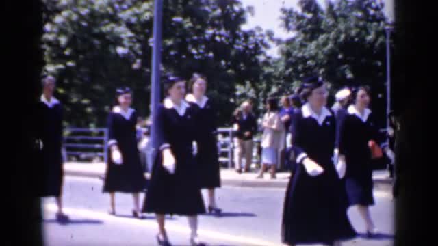 > 1966: beautiful women wearing black and white uniform walking down the road MINEOLA NEW YORK