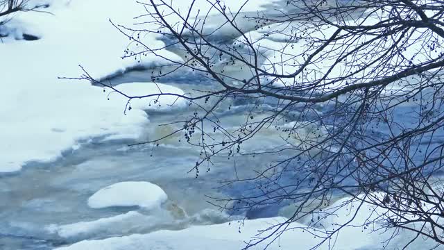 ice floating in river with clouds reflecting in water