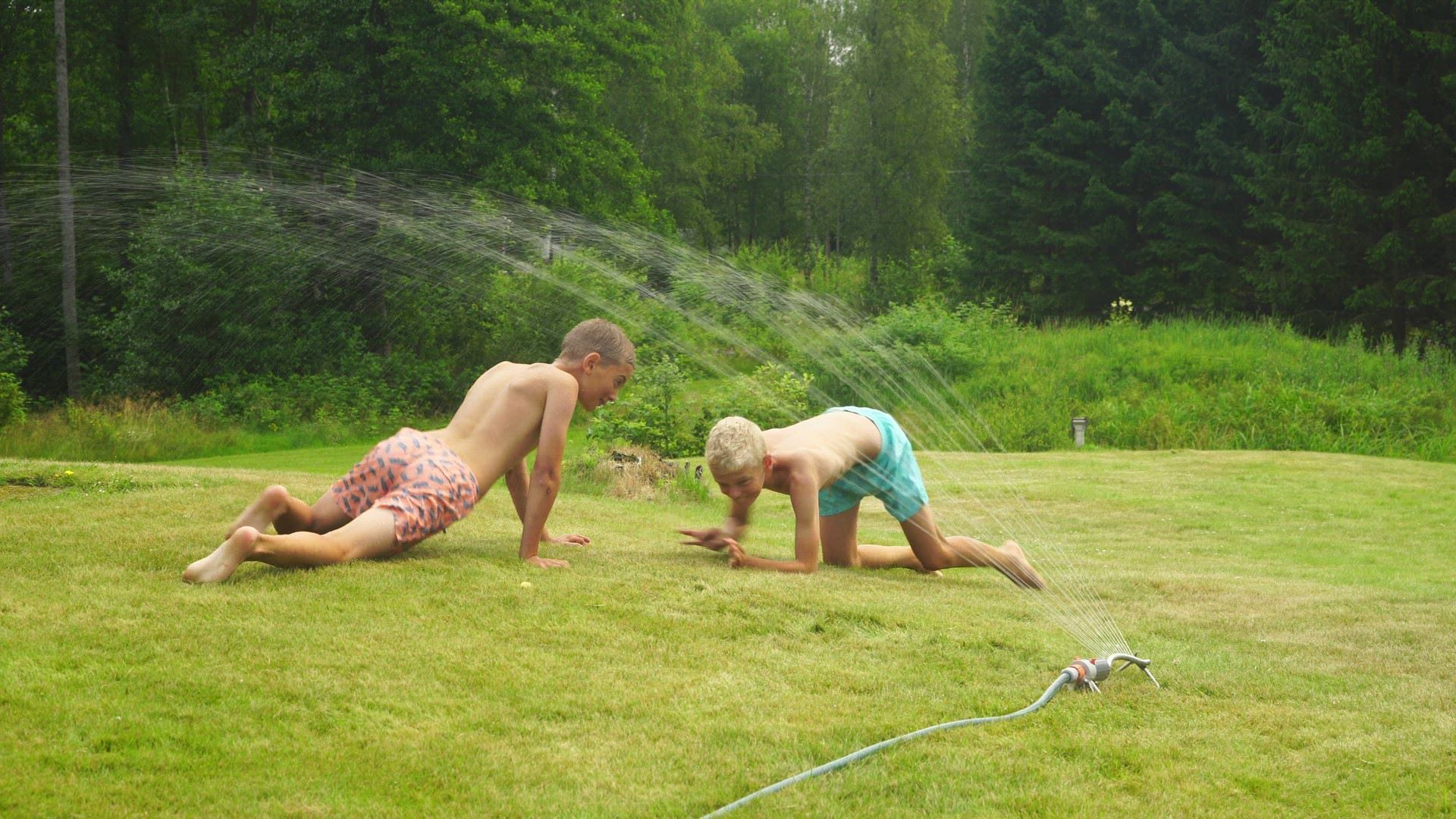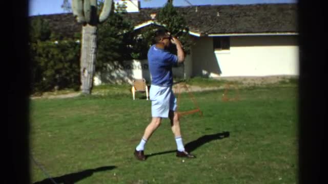 > 1968: a couple of people gathered in front of a house playing golf on the lawn on a sunny day SCOTTS