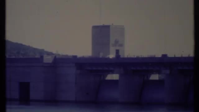 1971: bridge and building over water in front of a hill with cars driving across it CALIFORNIA