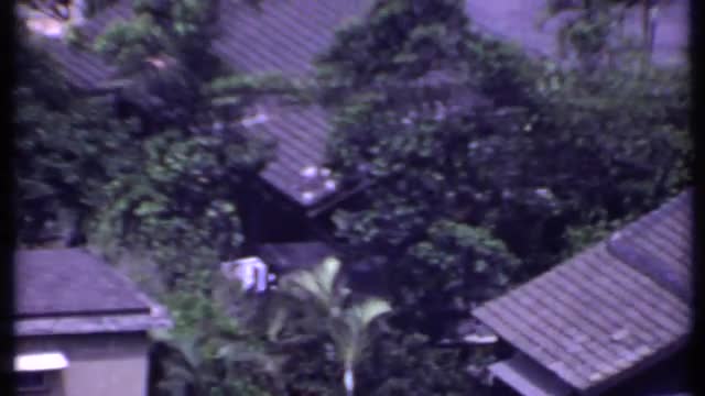 1969: aerial footage of suburban rooftops surrounded by trees. THAILAND