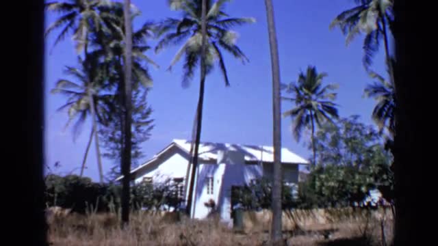 1970: a building and a shack in the midst of trees with people walking by INDIA