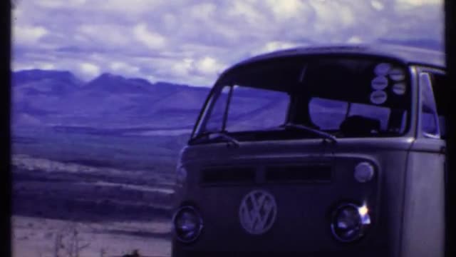 > 1969: man walks toward vw combi van with a beautiful mountain scene in the background. KENYA