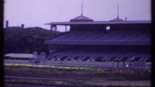 > 1969: panning footage of a large horse race track. INDIA