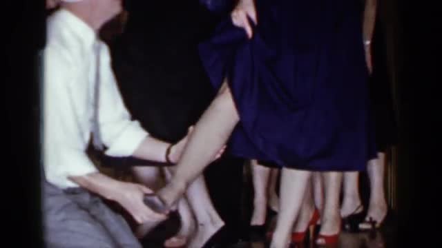 1966: a blindfolded man kneels on the floor and feels woman's legs, perhaps in an attempt to ide