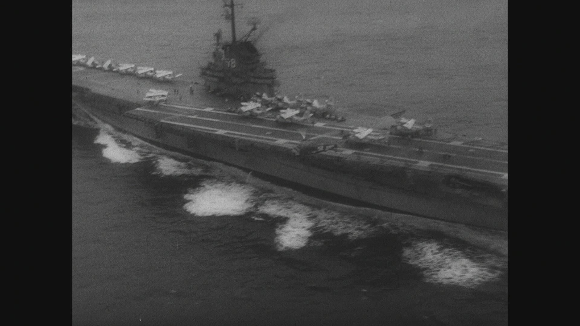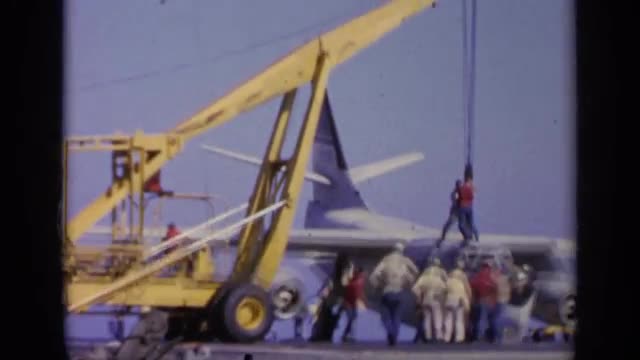 > 1963: view of aircraft carrier with crew out watching delivery of jet GREECE