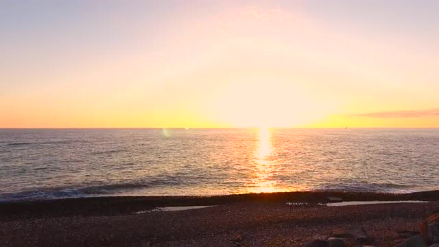 > Aerial View. Flying above the sandy beach stone sea at sunset. Sochi Adler olympiad. Aerial drone sh