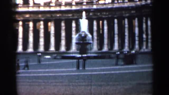 1962: building with cars driving past and people walking by a fountain CUBA