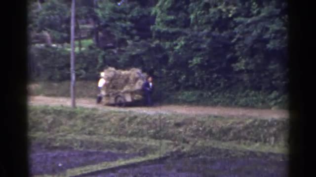 > 1953: two friends haul hay along a walking trail in a wheeled cart. JAPAN