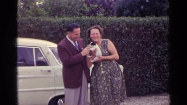 > 1961: the couple is happy to playing with the beautiful dog in her hands GERMANY